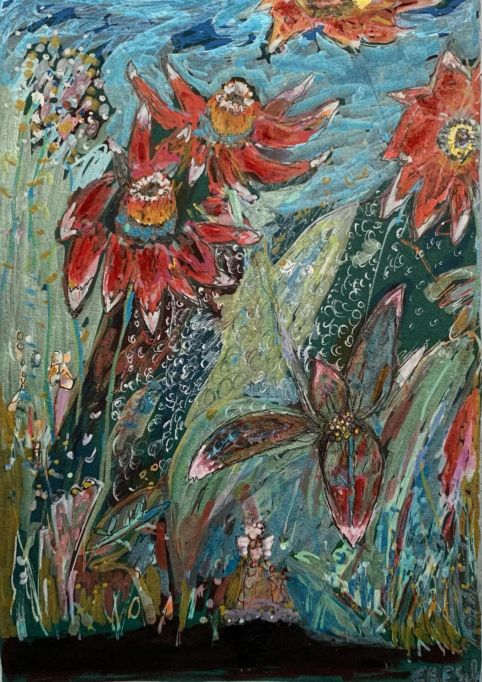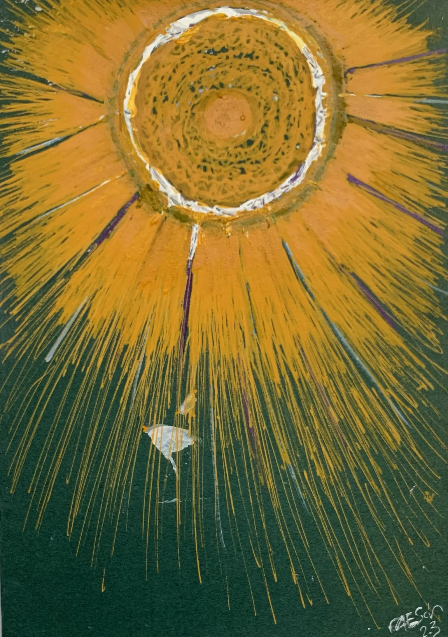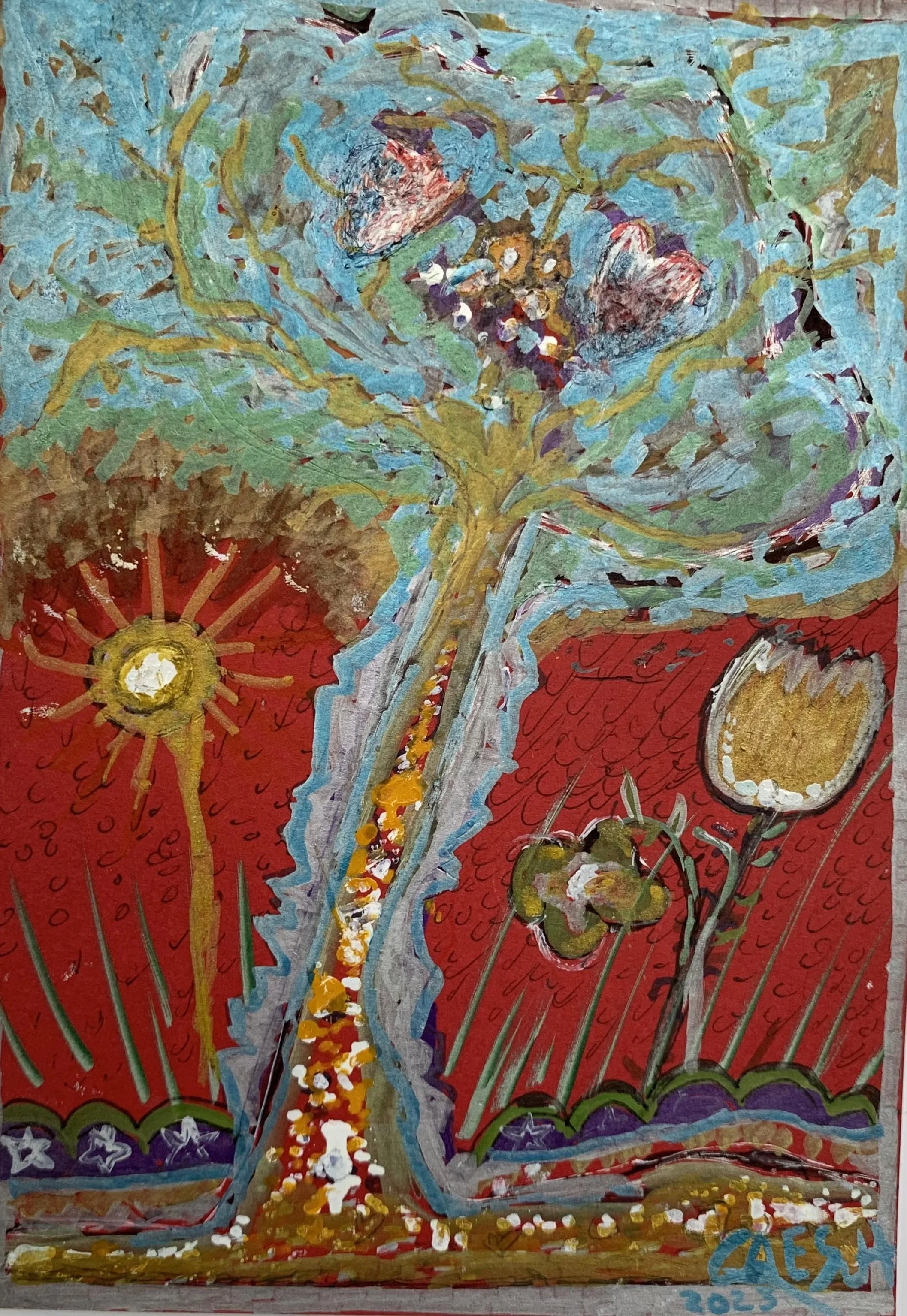 Dieser Baum erinnert an Stärke und Kraft aber auch an das Werden undVergehen. Er ist gemalt auf rotem Tonpapier.