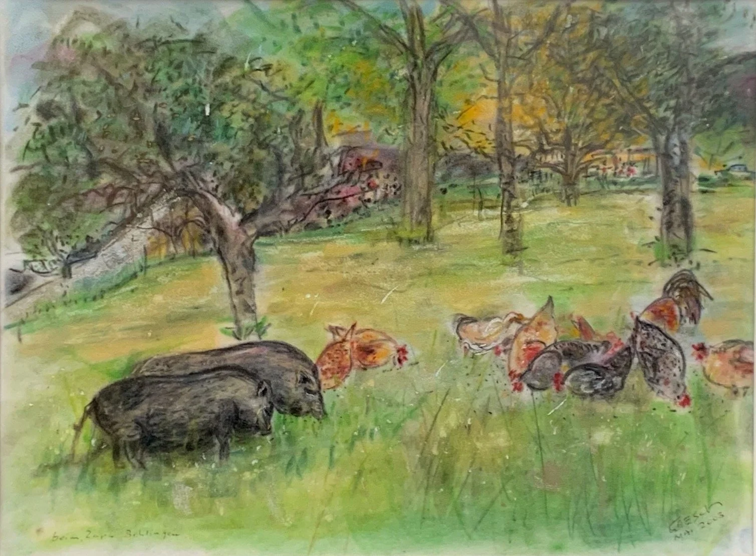 Dieses Bild entstand nach einem Foto. In der untergehenden Abendsonne brachten Restaurantbesitzer auf der Höri ihre Tiere auf die Wiese vor der Terrasse, wo die Gäste aßen. Ein schöner Anblick wie friedlich die Schweine neben den Hühnern grasten.