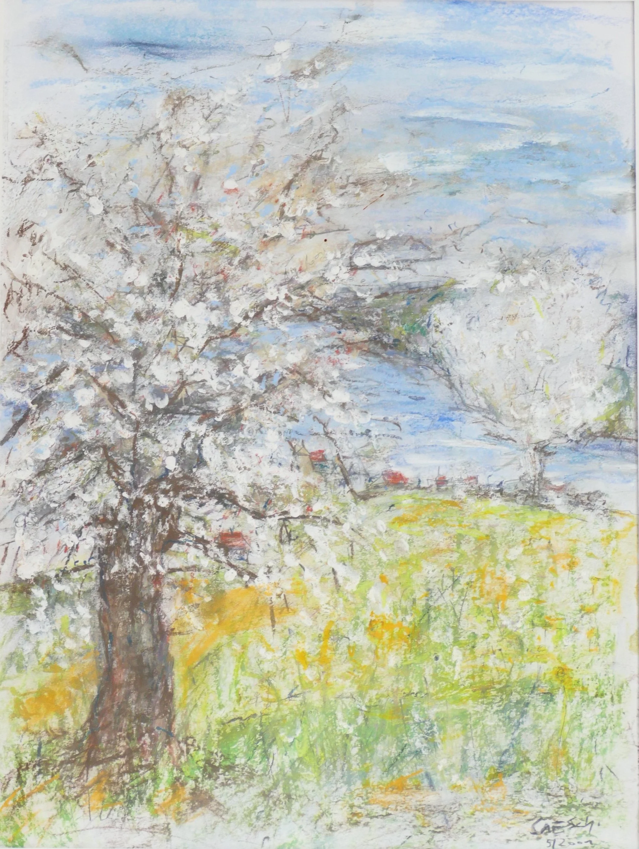 Dieser mit Grünpflamzen und Blumen geschmückte Weg führt zu einem Haus auf der Insel Reichenau. Papierbild in Ölpastell.