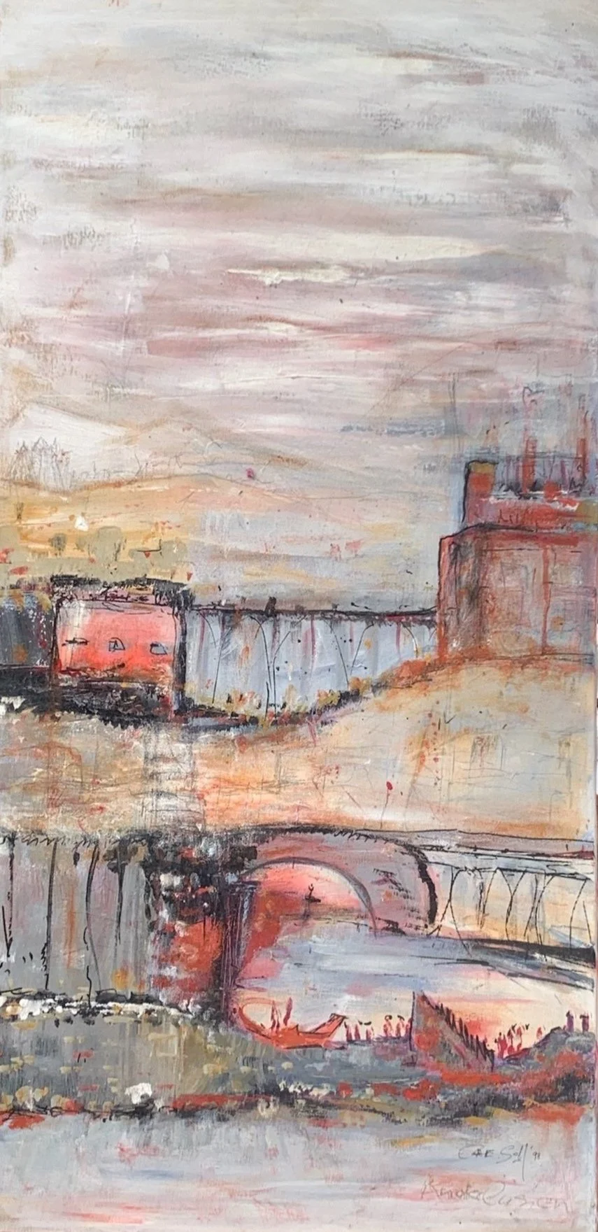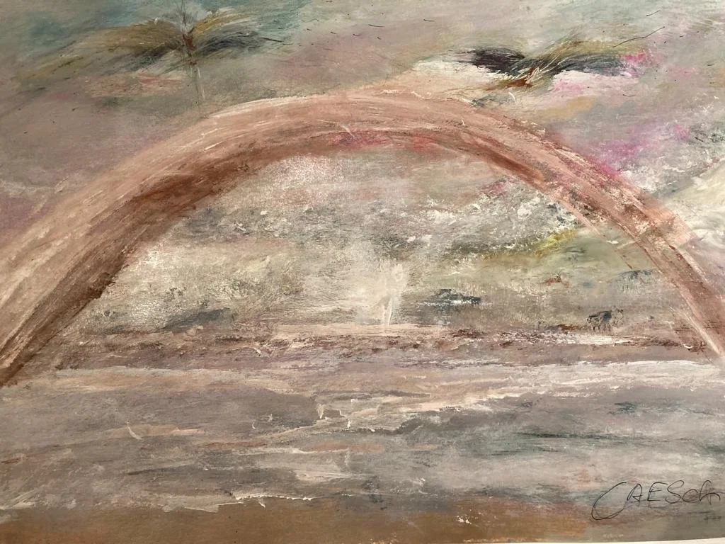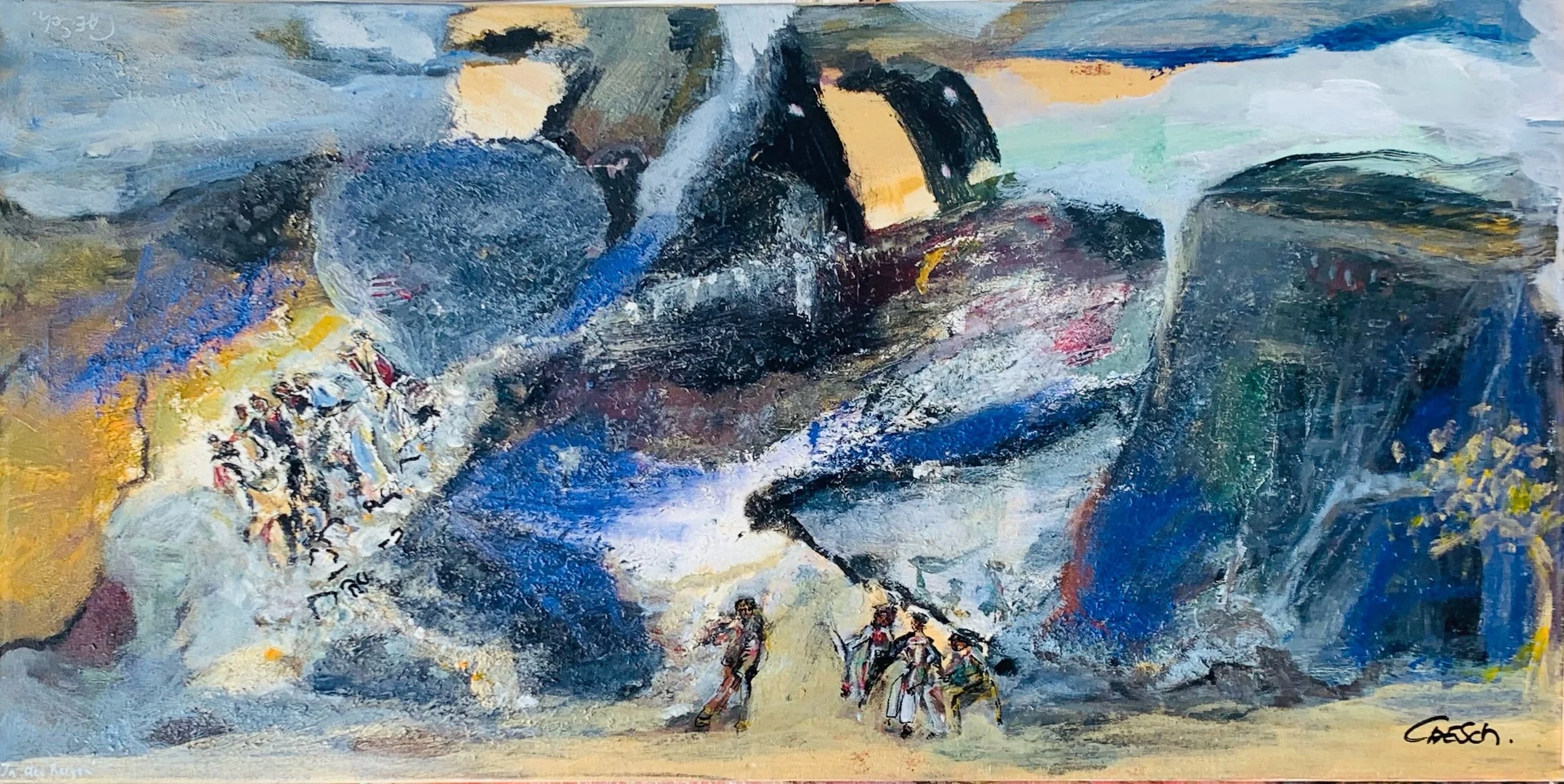 Dieses Bild entstand nach einem Foto, was ich in der Türkei gemacht habe. Wir waren zwischen riesigen Steinen eine Höhle besichtigen, als ein älterer Herr Angst bekam, den Rückweg anzutreten. Mehrere Menschen geleiteten ihn daraufhin ganz langsam und vorsichtig, den Berg wieder hinunter, während (unten rechts) die anderen auf die Gruppe wartenden.